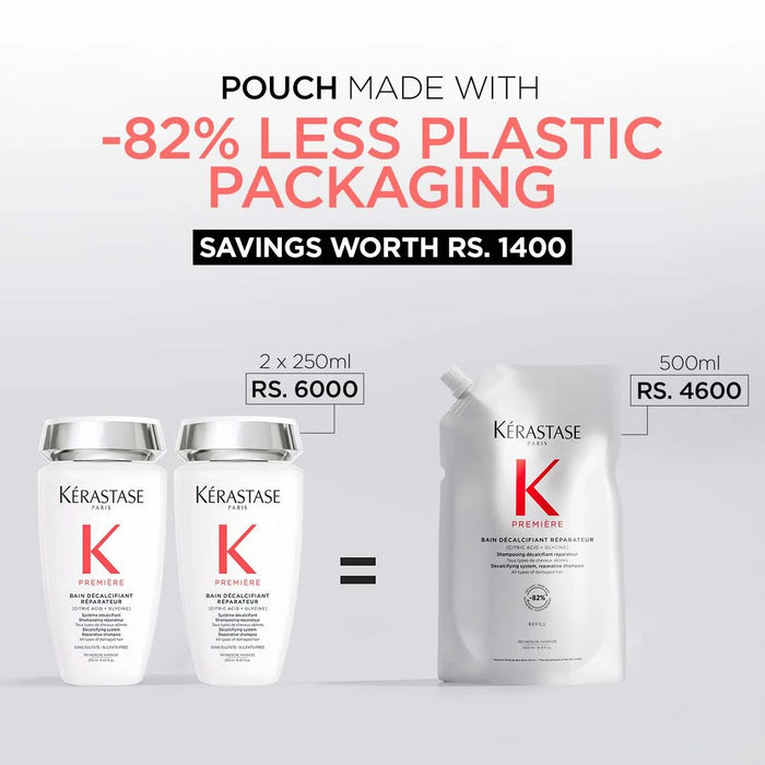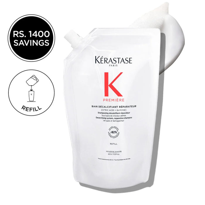 Kerastase Premiere Bain Decalcifiant Reparateur is a sulfate-fee premium solution shampoo designed to rejuvenate and revitalize your hair to its natural radiance. Crafted by Kerastase, renowned for its innovation in hair care, this exceptional shampoo offers a transformative experience for your locks. Infused with a potent blend of reparative and purifying ingredients of Citric Acid & Glycine, this shampoo gently yet effectively removes impurities, mineral buildup, and pollutants from your hair and scalp. Formulated with precision, it targets hard water residue, restoring your hair's vitality and shine with each use. Kerastase Decalcifying Repairing Shampoo is ideal for those seeking to restore the health of their hair, this luxurious shampoo nourishes and strengthens strands from root to tip, promoting resilience against daily environmental stressors. Its advanced formula works to repair damage, leaving hair feeling soft, supple, and visibly healthier after just one wash. Indulge in the sensorial experience of the Kerastase Premiere Bain Decalcifiant Reparateur Shampoo, as its delicate fragrance envelops your senses, creating a spa-like atmosphere in the comfort of your home. Kerastase Decalcifying Repairing Shampoo combines notes of citrus and mandarin with the enveloping harmony of orange blossom and jasmine, this luxurious aroma enhances your shower experience, transporting you to a world of relaxation and indulgence. Elevate your hair care routine with this exceptional product, and unlock the secret to beautifully revitalized hair with every wash.