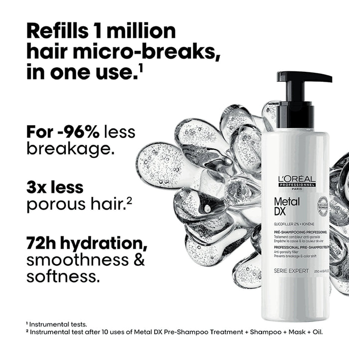 - The Metal DX pre-shampoo delivers healthier hair day after day, with visibly improved hair quality after continued use.