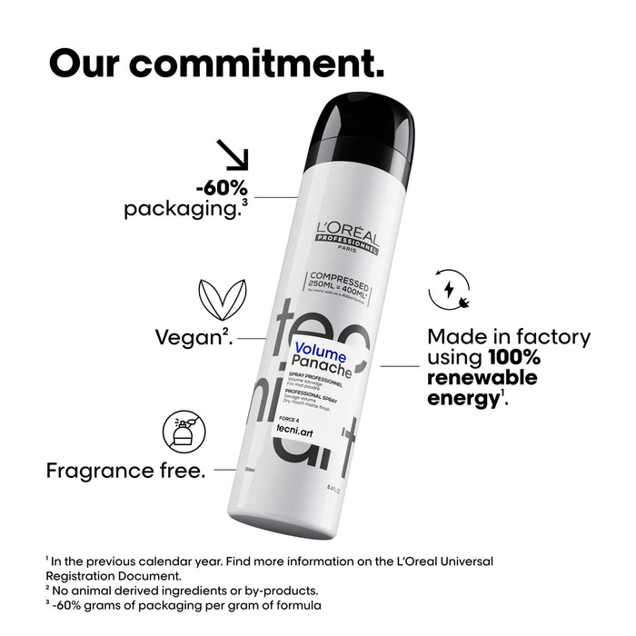 L'Oréal Professionnel tecni.art Volume Panache 250 ml professional styling spray for thick and secured looks with 60s XXL volume. Concentrated with lifters, this outrageous texturizing spray provides wild volume with a matte finish. Dry touch.