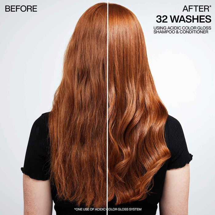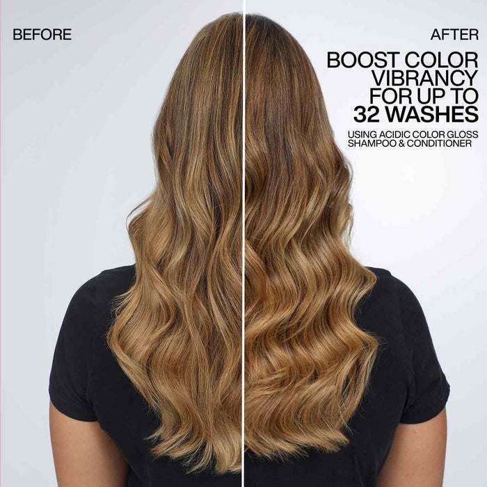 The latest innovation in color care, Redken's Acidic Color Gloss Shampoo is a revolutionary shampoo that extends color and provides salon-like shine. This sulphate-free shampoo provides long-lasting color vibrancy for up to 32 washes* and locks in intense molecular-level shine for up to 76% shinier hair**. Use as a complete routine with Acidic Color Gloss Activated Glass Gloss Treatment, Conditioner and Heat Protection Leave-In Treatment.